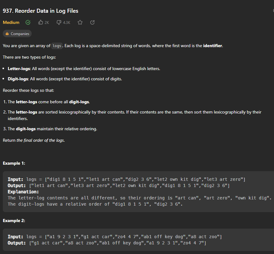 이 문제는 로그 파일의 재정렬 이라는 문제이다. 문제 제목부터 어려워 보이지만 그저 리스트 속의 문자열을 파일로 볼 때, 문자파일과 숫자파일을 규칙에 맞게 정렬하면 되는 문제이다.
