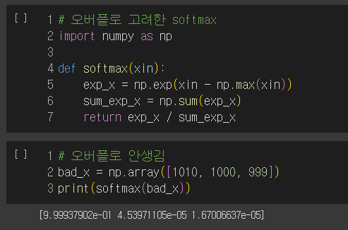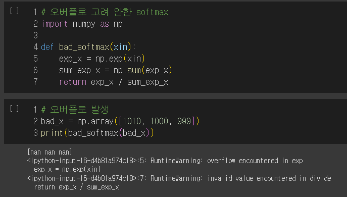 소프트맥스 함수를 이용할 때 주의해야하는 점이 있다. 바로 "Overflow"이다. 소프트맥스 함수에는 지수함수가 포함되어 있는 것을 알 수 있다. 이로인해 input이 조금 증가하더라도 결과는 기하급수적으로 증가하는 결과를 낸다. 아래 예시를 보면 알 수 있다.