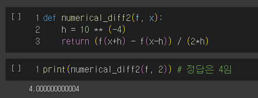 코드로 구현할 때는 반올림 오차에 주의해야하므로 미세한 변화(델타x 혹은 h 라고 표기함)의 값을 대략 1e-4로 잡는다. 또한 기존에 구하던 차분 방식은 전방차분으로 x 값이 충분히 작지 않은 경우에는 오차가 존재할 수 있다. 따라서 중앙 차분을 이용해서 그 오차를 최대한으로 줄여준다.