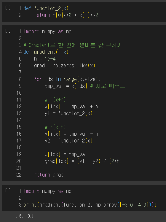 편미분은 여러 변수가 존재할 때 하나의 변수로만 미분을 진행하고 나머지는 상수로 취급하는 미분을 의미한다. 이것을 코드로 구현하면 아래와 같다. ( 예시: y = x1 ^2 + x2 ^ 2 의 편미분 )