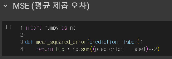 MSE는 단순하게 실제값과 출력값의 오차 제곱의 평균을 계산하는 방법이다. 직관적으로도 손실함수라고 이해가 될 것 같다. 공식과 구현은 아래와 같다.