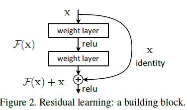 즉 연구자들은 모델이 모든 출력에 대해 학습하는 것 자체를 힘들다고 판단한 것이다. 그것이 Degradation problem이 발생하는 이유이다. 이를 해결하고자 모든 출력값을 학습하는 것이 아니라, 아래 그림과 같이 어떠한 block을 정의하고 여기의 input과 결과 출력 사이의 차이(residual)만을 학습하도록 하는 방식이다. 구절에서도 나와 있듯이 이 residual을 zero로 최적화하는 것이 더욱 쉽다는 것이 연구자들의 생각이었다. 이것을 수식으로 나타내면 아래와 같다.