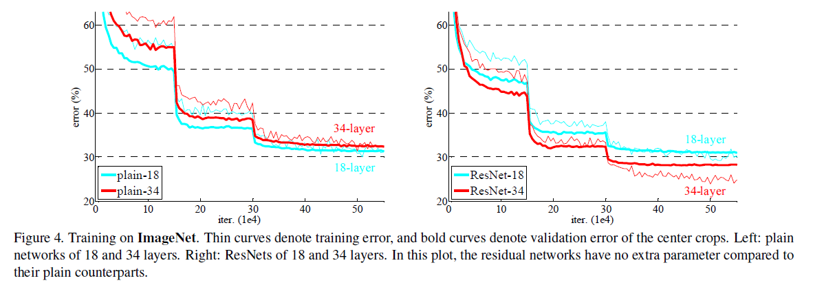 ImageNet 데이터를 각각 plain(왼쪽)모델과 ResNet(오른쪽)으로 학습(얇은 그래프) 및 검증(두꺼운 그래프) 한 결과이다. 추가적으로 빨간색은 깊은 모델, 민트색은 얕은 모델을 나타낸다. 결과 분석에서 포인트는,