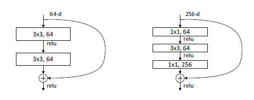 여기서 1x1 conv로는 dimension을 줄이고 늘리는 역할을, 3x3 conv로는 smaller input/output dimension을 다루는 데 사용되도록 block을 구성하였다. 마찬가지로 identity shortcut mapping을 사용한다.