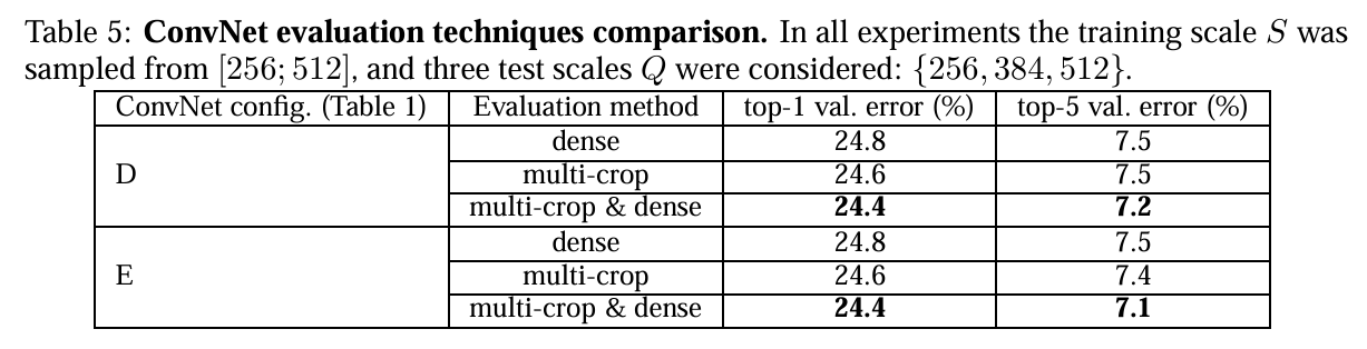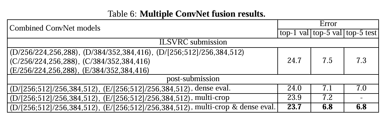 당시 대회에는 1개의 multi-scale D model과 single scale C, D, E model 6개로 앙상블하여 제출하였다고 한다. 대회 이후 성능이 좋은 multi-scale 2개 D, E 모델로 dense, multi-crop evaluation을 적용하여 최고 결과인 top-5 error 6.8%를 기록하였다고 한다.