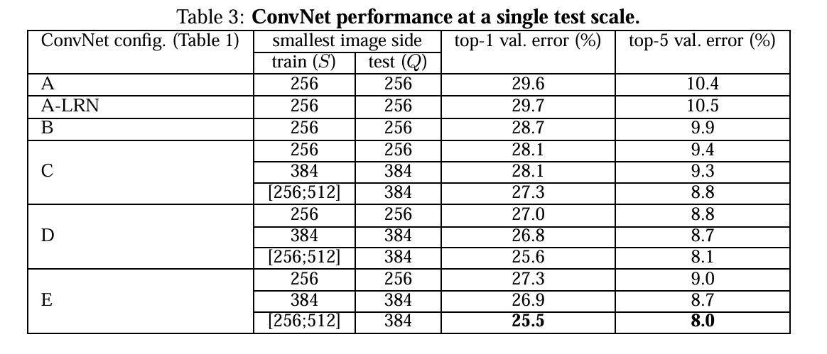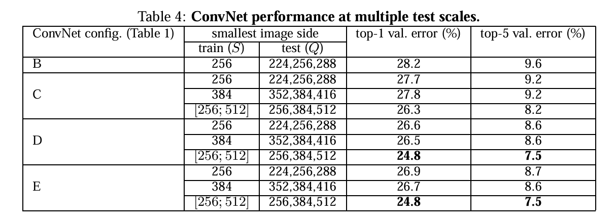 IV. 마지막으로 train 과정에서 input image 크기인 S를 multi-scale로 학습한 것이 각 network에서 더욱 좋은 성능을 내는 것을 알 수 있다. scale jittering의 효과를 알 수 있는 결과이다.