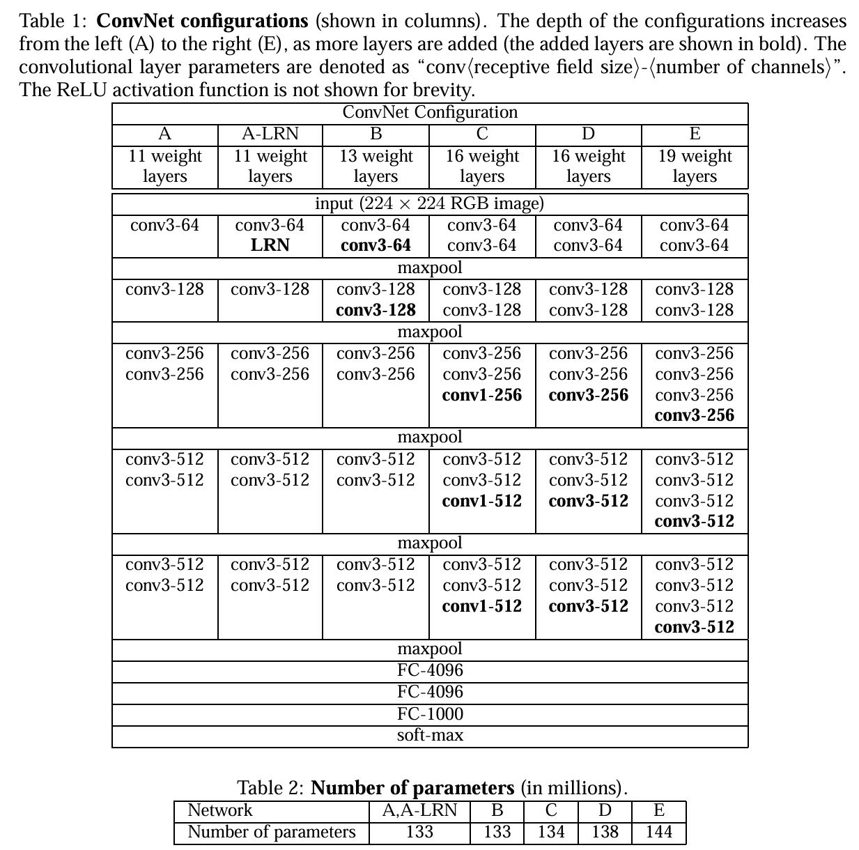 이를 고려하여 완성된 모델의 구조를 살펴보면 다음과 같다. 224x224 RGB 이미지로 input은 고정되었다고 쓰여있다. 연구를 진행할 때는 11 layer, 13 layer, 16 layer, 19 layer로 구성하였고, 3개의 layer는 분류를 위한 마지막 Fully Connected layer임을 알 수 있다. 문제 해결에서 본 것과 같이 3x3 conv와 1x1 conv만으로 모델이 구성된 것을 알 수 있다. 각 conv layer에서 stride는 1로 고정되고 padding은 'same'으로 진행했다. Max pooling layer는 2x2 window와 stride 2로 진행하였다. 모든 conv layer에는 ImageNet에서와 같이 ReLU를 적용하였다고 설명한다. 11 layer 모델에서 LRN(Local Response Normalisation)을 시도하였으나 성능 향상이 없어서 이후 깊은 모델에서는 실험하지 않았다고 서술한다.