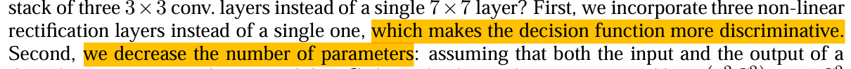 위의 그림에서 알 수 있듯이 3x3 conv가 연속으로 2개 쌓이면 결과적으로 5x5 conv와 동일한 역할을 하게 된다. 7x7 conv도 3개의 3x3 conv로 마찬가지로 치환이 가능하다. 저자는 stack 사이에 비선형 함수까지 추가한다. 그렇다면 이게 어떠한 이점이 있을까?