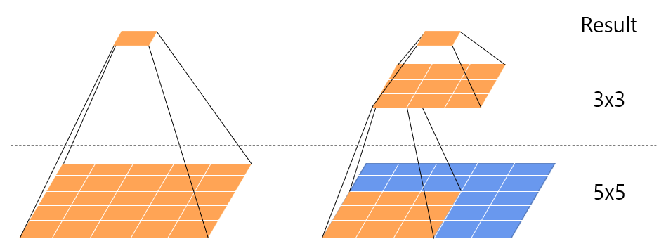 논문의 저자가 제시하는 아이디어는 5x5 conv를 3x3 conv 2개의 stack으로 치환하는 것, 그리고 7x7 conv를 3x3 conv 3개의 stack으로 치환하는 것이다. 이것이 어떻게 동일하고 어떤 효과가 있을까? 먼저 이해를 쉽게 하기 위해 그림으로 보자.