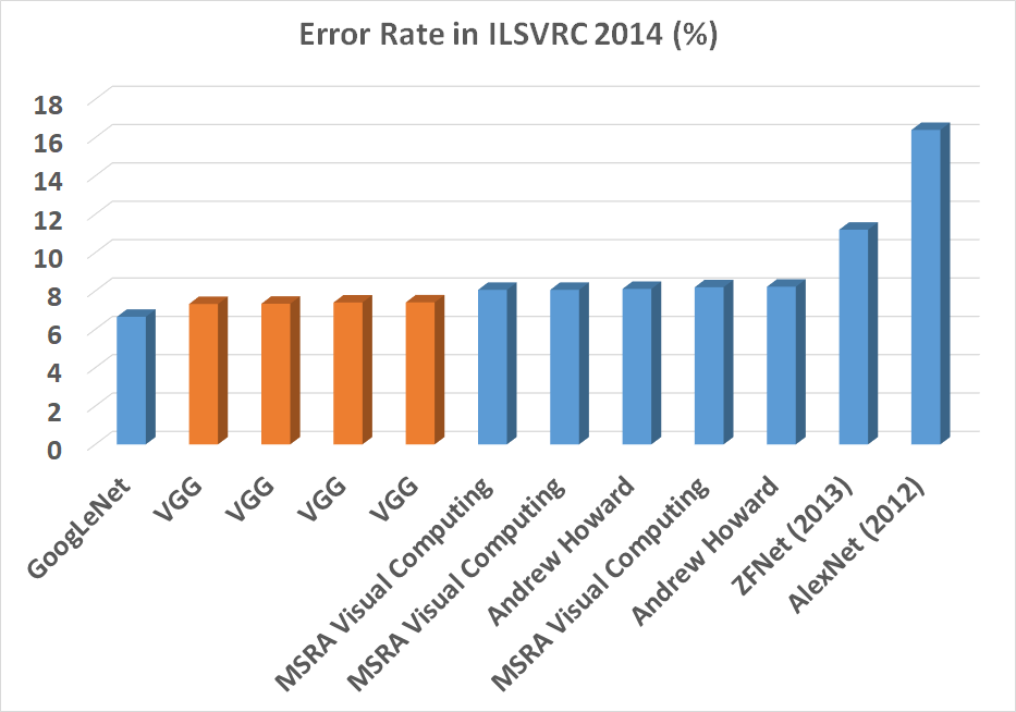 아래 사진은 각각 ILSVRC 대회의 1등 모델들과 에러율 그리고 2014년 대회에서의 결과이다.