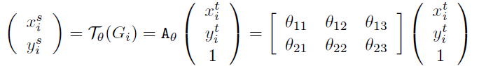 즉 이제 transform (여기서는 affine transformation)을 위한 파라미터 세타와 output map에서 regular grid를 알고 있다. 그렇다면 아래와 같은 식으로 input map에서 sampling grid를 구한다.