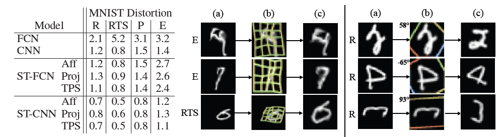 결과는 위의 사진과 같다. 먼저 RTS 변형에서 CNN과 ST-FCN의 Aff 버전을 살펴보면 0.8%로 같은 error rate를 보여준다. 이것으로 STN이 max pooling과 같이 invariance를 부여한다는 것을 알 수 있다. ST-CNN과 ST-FCN 중에서는 ST-CNN이 우수한 것을 알 수 있다. 이것은 CNN에 추가적으로 사용된 max pooling layer의 영향과 CNN의 우수함이 복합적으로 나타난 결과라고 생각된다. Transformation 측면에서는 TPS가 미세하게 우수한 결과를 내는 것을 확인할 수 있다.