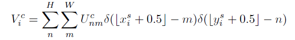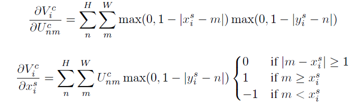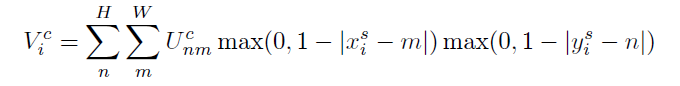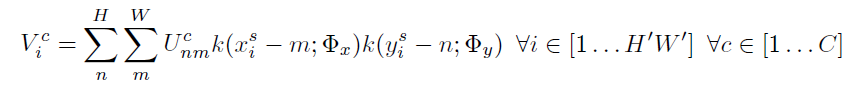 위의 식은 sampling 하는 식을 일반화하여 나타낸 것이다. Φx와 Φy는 generic sampling kernel k()의 parameter로 이해하면 된다. U^c_nm은 input feature map의 channel c에서 (n,m)위치에 존재하는 value를 의미한다. 구하는 값인 V^c_i는 output map의 channel c에서의 pixel i 값을 의미한다. Differentiable을 위해서 우리에게 중요한 것은 어떤 sampling kernel을 사용하는가 이다.