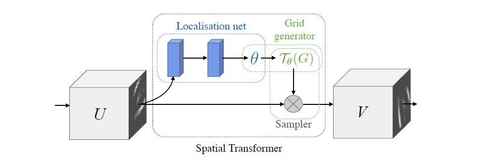U는 input feature map, V는 최종 output map을 의미한다. 네트워크의 단계를 살펴보면, input U가 들어가면 이 이미지의 feature map을 localisation network에 투입한다. 해당 네트워크는 파라미터 세타를 학습한다. 이 세타는 smpling grid를 만들게 되는데, 이를 통해 어떤 지점을 잡아야 원본 이미지를 알아보기 쉬운 상태로 만들 수 있는지 학습한다. 최종적으로 input image feature map과 sampling grid가 sampler의 input으로 들어가고 최종 변형된 output map이 나오게 된다.